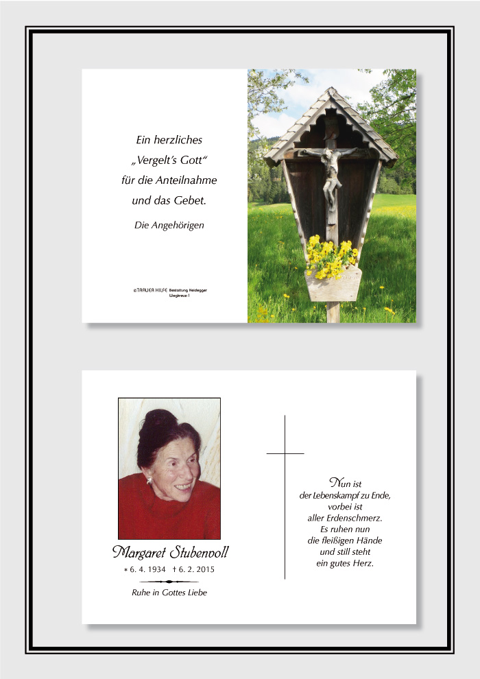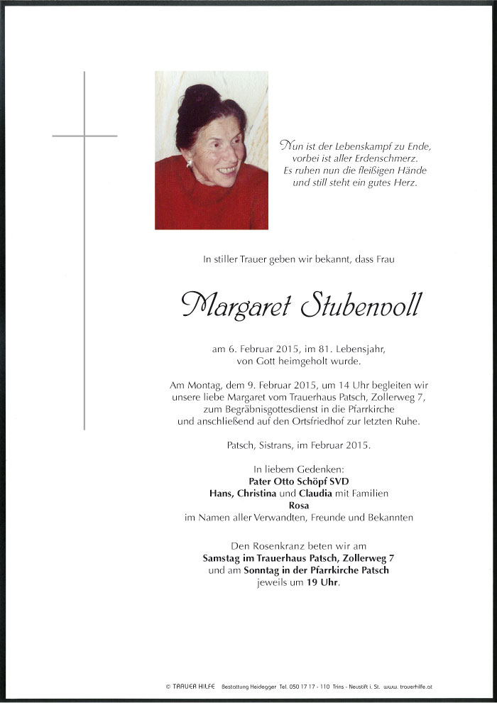 Bestattung wurde durchgeführt von: Karl Neurauter Karl Neurauter Bestattung Heidegger Brennerstraße 69 6150 - Steinach am Brenner Tel.: 05275 5211 zum Bestatter