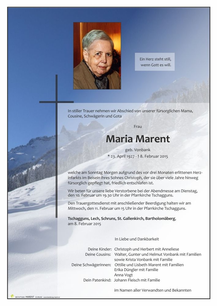 Bestattung wurde durchgeführt von: Peter Marent Bestattung Marent GmbH Gantschierstraße 80 6780 - Schruns Tel.: 05556 77070 zum Bestatter