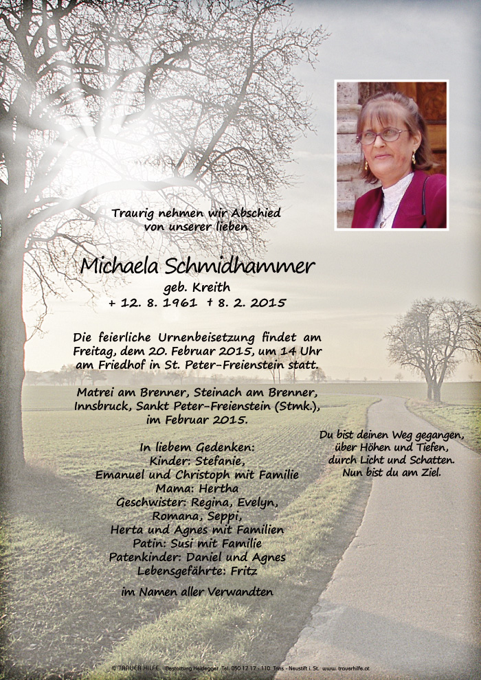 Ich lebe seit jahren in Tirol und durch zufall habe ich erfahren das du von dieser Welt gegangen bist.Ich bin sehr traurig nach so langer zeit wieder etwas von dir zu erfahren leider nichts fröhliches . Wir sind zusammen in die Schule gegangen . Leider haben wir uns nie wieder gesehen . Pfiati Michaela