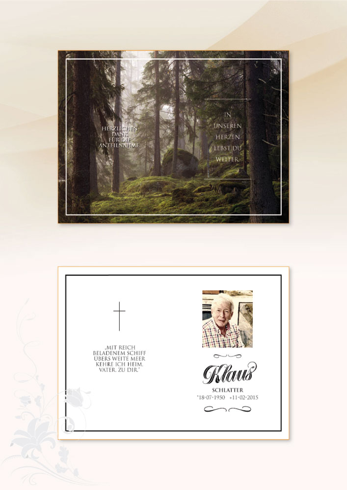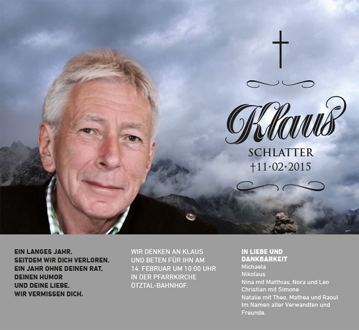 Eines Morgens wachst du nicht mehr auf.Die Vögel singen wie sie gestern sangen.Nichts ändert diesen neuen Tageslauf.Nun bist du fortgegangen.Du bist nun frei und unsere Tränen wünschen Dir Glück.Mochs guat Klaus.Schwester Erika und Franz.