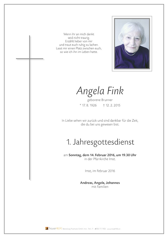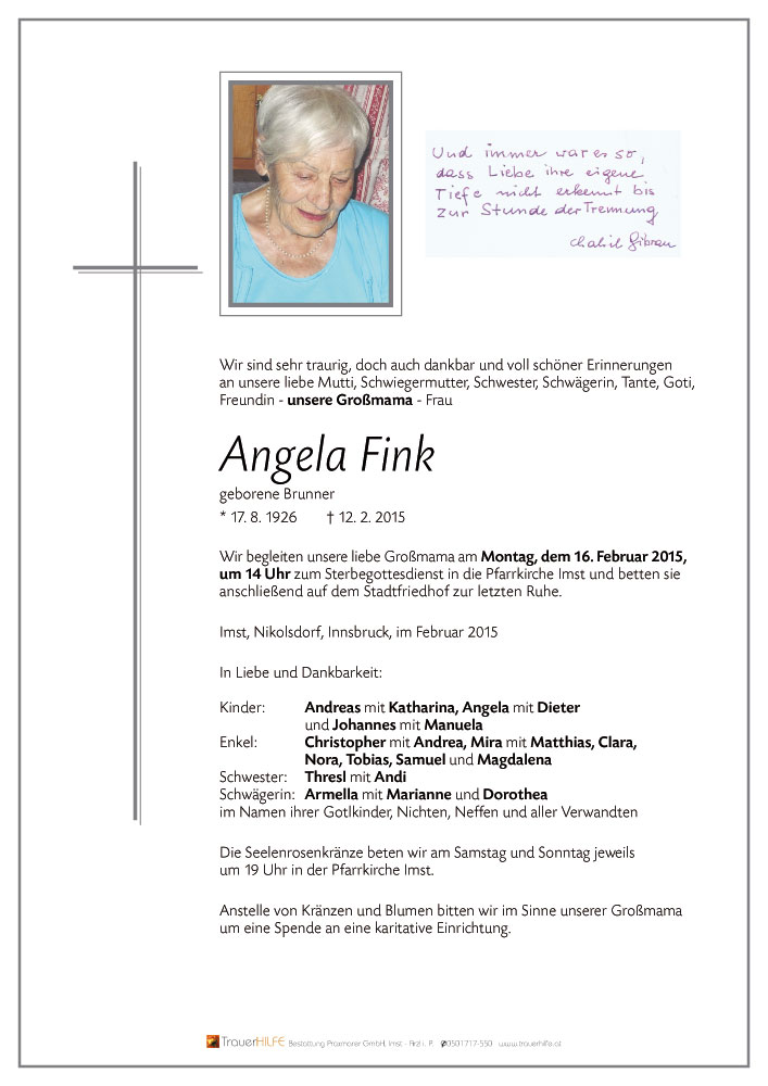 Betroffen haben wir vom Ableben eurer lieben Mutter und Großmutter, Frau Angela Fink, erfahren.