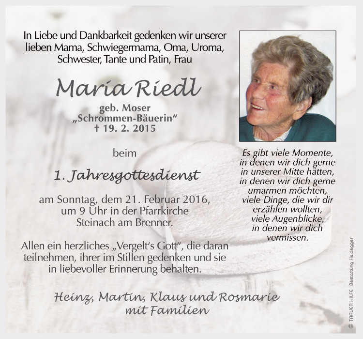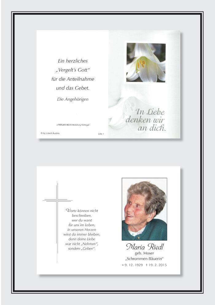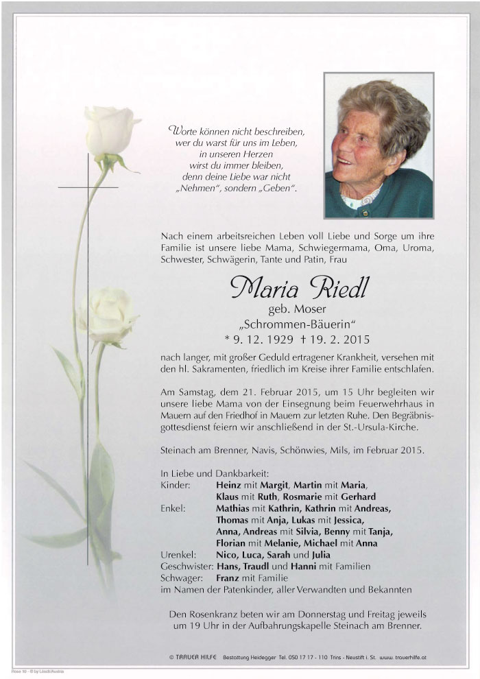 Bestattung wurde durchgeführt von: Karl Neurauter Karl Neurauter Bestattung Heidegger Brennerstraße 69 6150 - Steinach am Brenner Tel.: 05275 5211 zum Bestatter