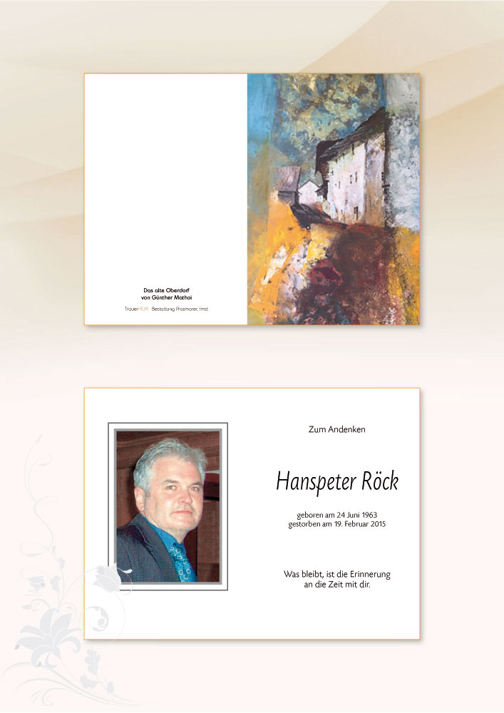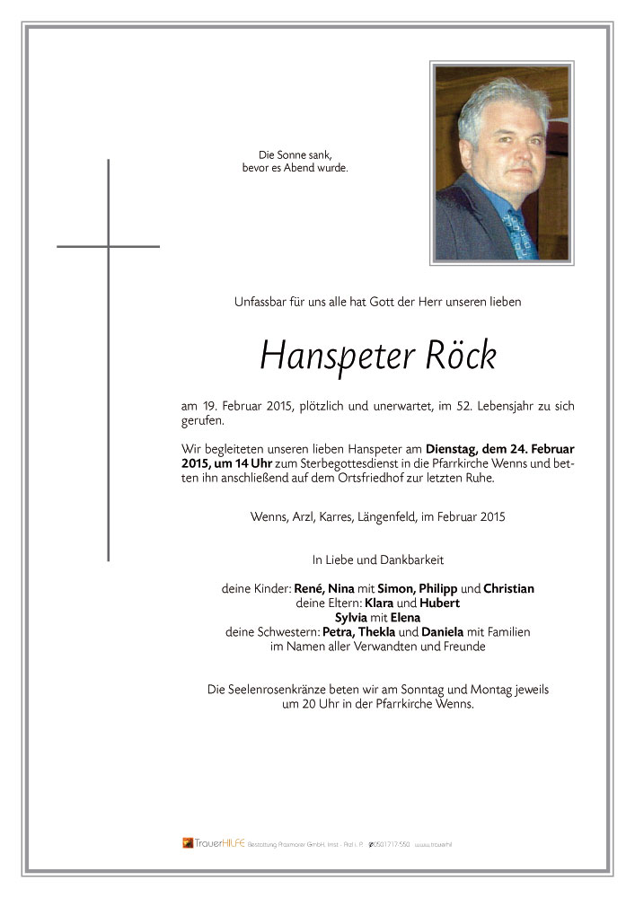 unfassbar und betroffen haben wir vom Verlust eures Hanspeter erfahren - vor kurzem besuchte er uns noch auf der UAlm... schöne Erinnerungen an eine unbeschwerte Kindheit bleiben... viel Kraft und Zuversicht wünschen wir von Herzen in dieser schweren Zeit!23.02.2015 09:47 - Brigitte Lung mit Familie