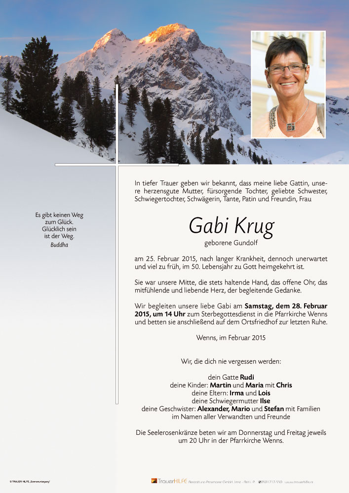 Sie war meine Schulfreundin - immer unter den Besten ihrer Klasse - fröhlich und unbeschwert war die Hauptschul- und Jugendzeit in Wenns. Klug, liebenswert und pflichtbewusst - so werde ich die Gabi in meiner Erinnerung behalten...