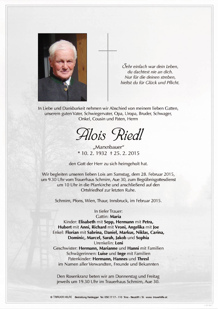Bestattung wurde durchgeführt von: Karl Neurauter Karl Neurauter Bestattung Heidegger Brennerstraße 69 6150 - Steinach am Brenner Tel.: 05275 5211 zum Bestatter