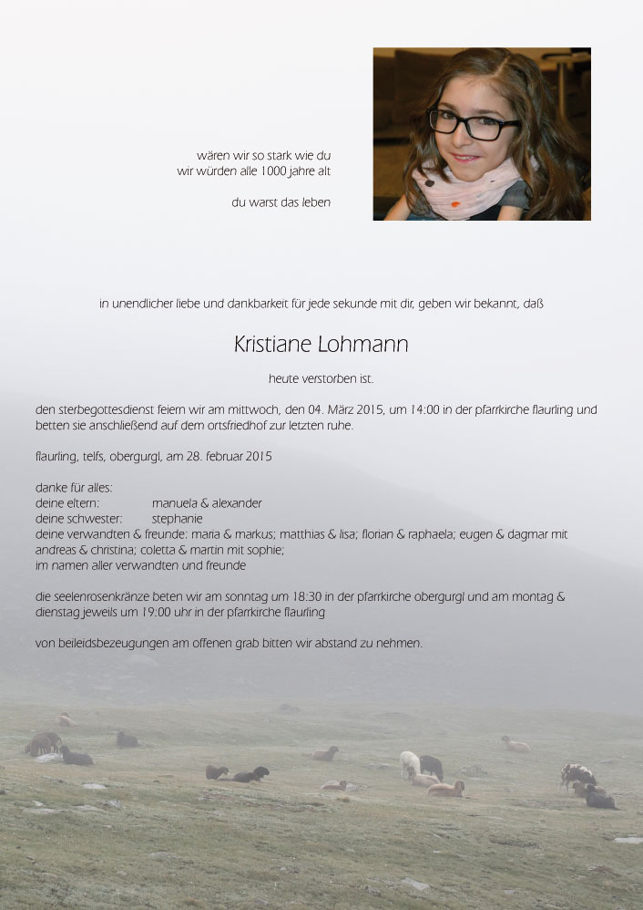 wir wünschen Euch viel Kraft und Gottes Segen um den Verlust Eurer Kristiane ertragen zu können.04.03.2015 09:37 - Fam. Maria Eberhart