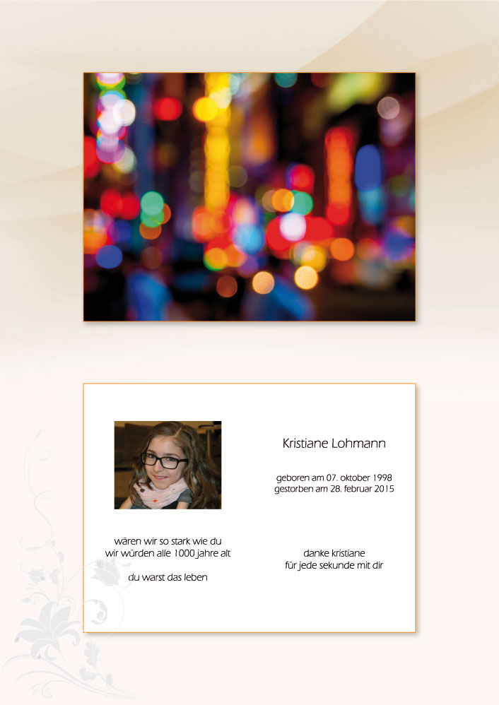 Das Lachen von Eurer Kristiane wird immer in Eurer Erinnerung und in Euren Herzen bleiben.