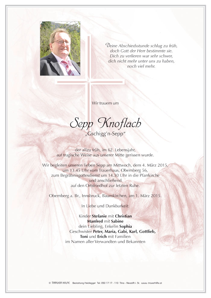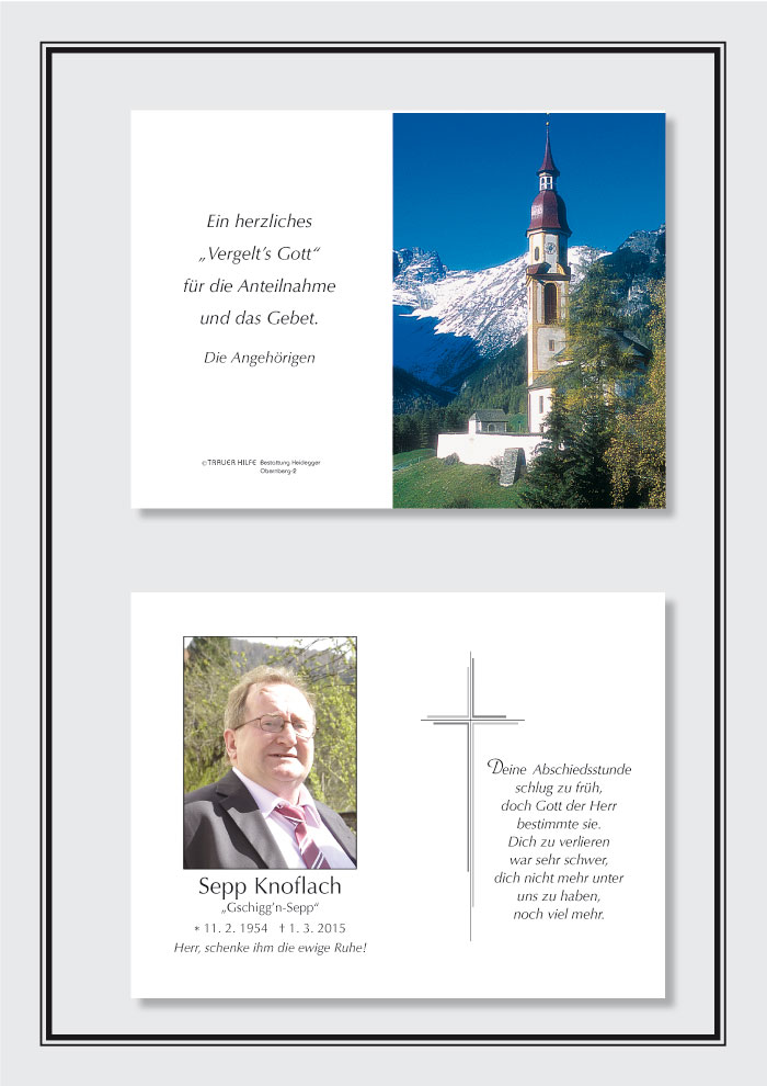 Bestattung wurde durchgeführt von: Karl Neurauter Karl Neurauter Bestattung Heidegger Brennerstraße 69 6150 - Steinach am Brenner Tel.: 05275 5211 zum Bestatter