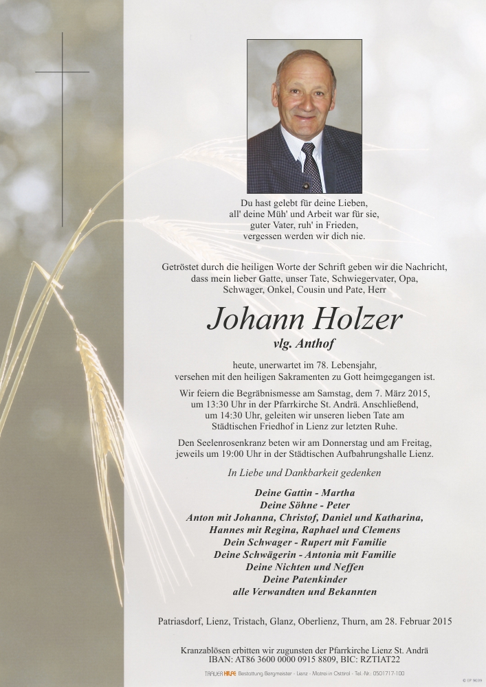 Neue Kerze für Johann Holzer entzünden.