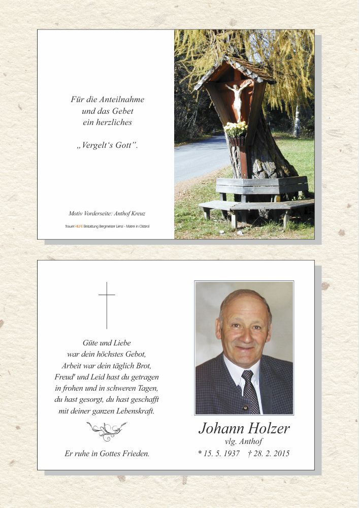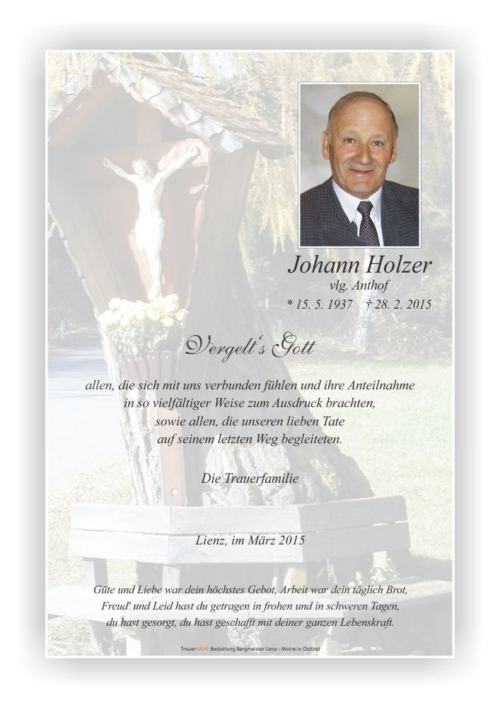 Euer Tate hat jetzt seine Reise angetreten – hinüber in das Land, das jenseits unserer Vorstellungskraft liegt, dorthin, wo nur mehr das Bedeutung hat, was wir im tiefsten Herzen wirklich sind – reine, unendliche Liebe. Wir wünsche euch, dass das, was euer Tate euch an liebevoller Zuwendung geschenkt hat, euer Herz mit Dankbarkeit und Wärme erfüllen möge. Möge die Liebe Gottes euch umarmen und durch die Zeit der Trauer und des Verlustempfindens tragen.