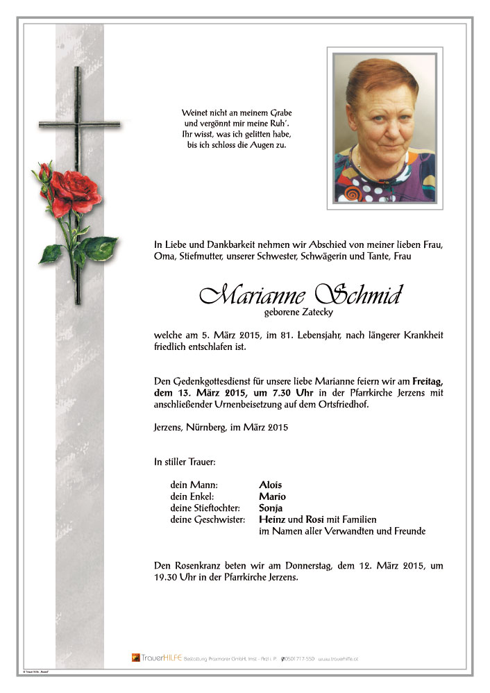 Zum Heimgang von Marianne möchte ich euch mein herzliches Beileid ausdrücken und wünsche euch viel Kraft für die kommende Zeit.