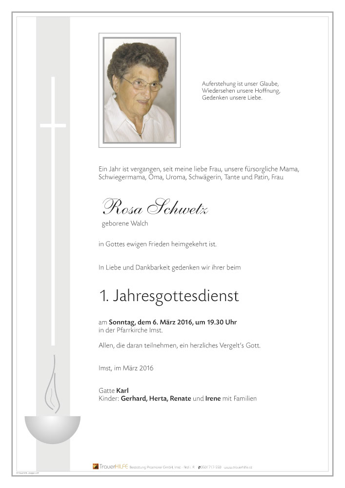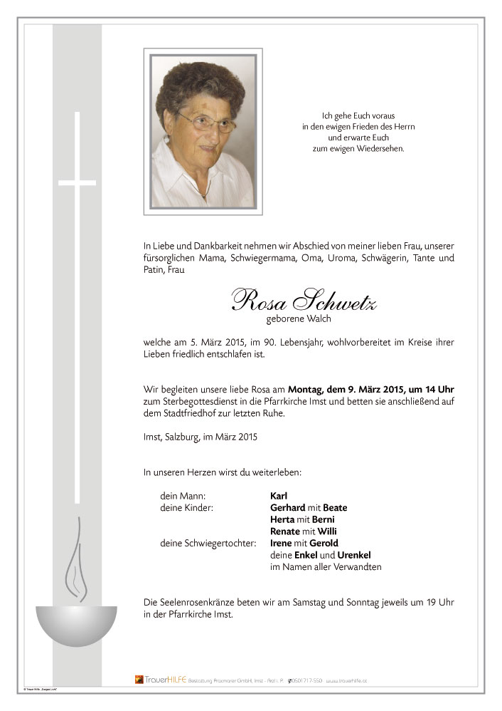 Meine aufrichtige Anteilnahme Euch allen. Sie hat jetzt bestimmt eine wunderbare, bleibende Stätte des Friedens und der Freude. Ich freue mich mit ihr. Diakon Andreas Sturm, Pfarre Imst