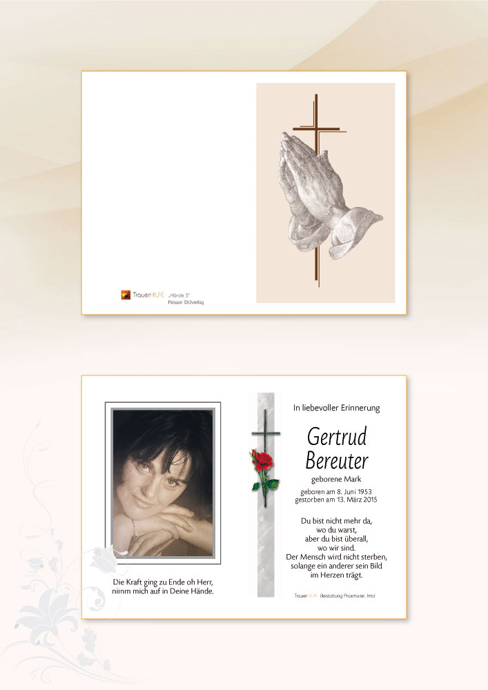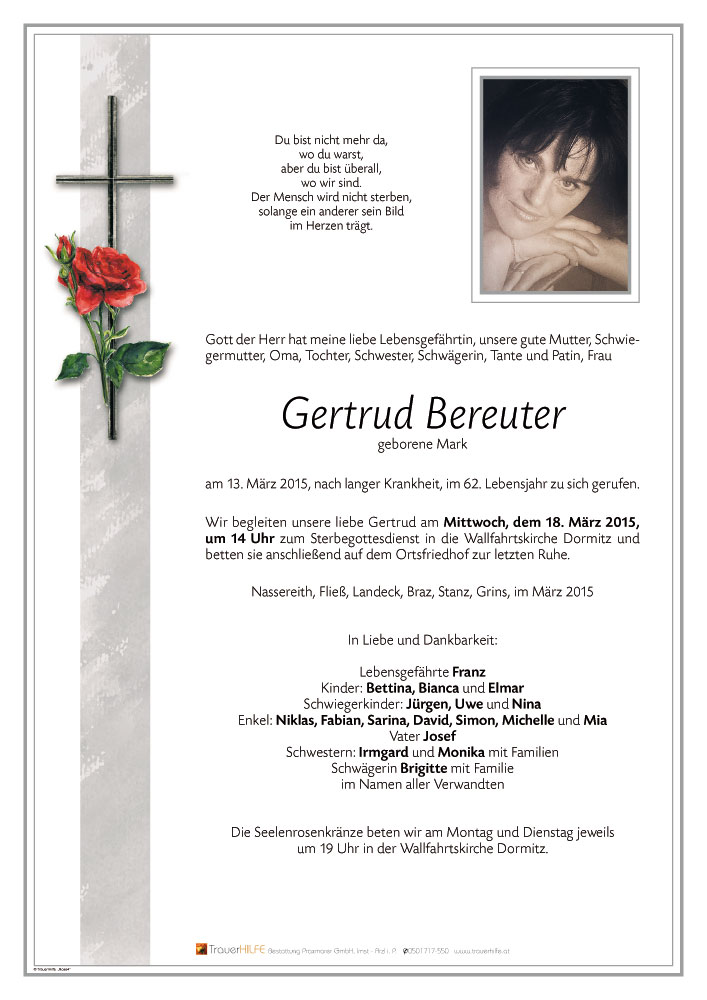 Lasst Euch fallen in Eurer Trauer und schämt euch nicht eurer Tränen, weinet um vergangenes Glück, aber öffnet Eure Herzen für all die Liebe die Euch Gertraud gegeben hat.