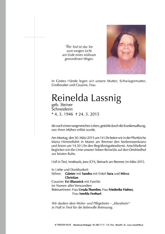Bestattung wurde durchgeführt von: Karl Neurauter Karl Neurauter Bestattung Heidegger Brennerstraße 69 6150 - Steinach am Brenner Tel.: 05275 5211 zum Bestatter