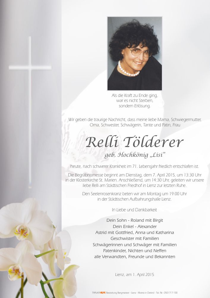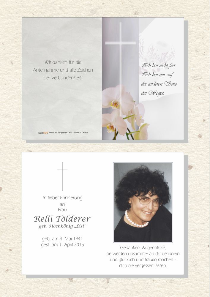 ich bin ja oft bei meiner tante+ging mit ihr viel mit tante+relli grüßte immer so fein+icvh auch es war ja auch so nachbarschaft+wollte auch allen verwanten+freunde+bekannten mein herzlichstes beileid sagen sie fuhr mit den fahrrad sie war eine sehr nette schade das sie nicht mehr da ist alle werden wir sie vermissen besonders meine tante meine mutter ist auch gestorben+sie kannte sie gut sie lebt in allen weiter sie ist bei gott sie war die tollste+netteste freundin+wie sie jedes mal den namen meiner tante hezig+lustig gesagt hat du wirst uns fehlen aber du bleibst im herzen sie ist nicht tod sie lebt inn dir im herzen sie kommt wenn du schläfst zu dir+berührt dich du merkst es nicht überall wo du hin gest+was du machst sie ist bei dir+beschützt dich+redet mit dir ob sie gleivch zu dir kommen würde sie ist zu gott gekommen+ist ein engel wir mochten sie wir tragen sie in unseren herzen wir behalten sie in erinnerung meine tante war so freundin für sie und relli du für meine tante aber ihr seit trotztem noch beste freundinnen egal ob sie in einen anderen ort ist im himmel oder sie lebt ist ja nomal man kann trotztem noch eine freundinn wie meine tante haben+du relli hast im himmel oder qwo du bist egal ob gestorben bist du hast trotztem eine beste freundinn das ist meine tante alberta sie vergisst dich nie+du sie nicht betet dann erhört sie einen ich mag relli egal ob gestorben oder nicht