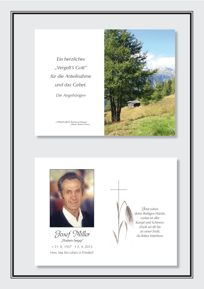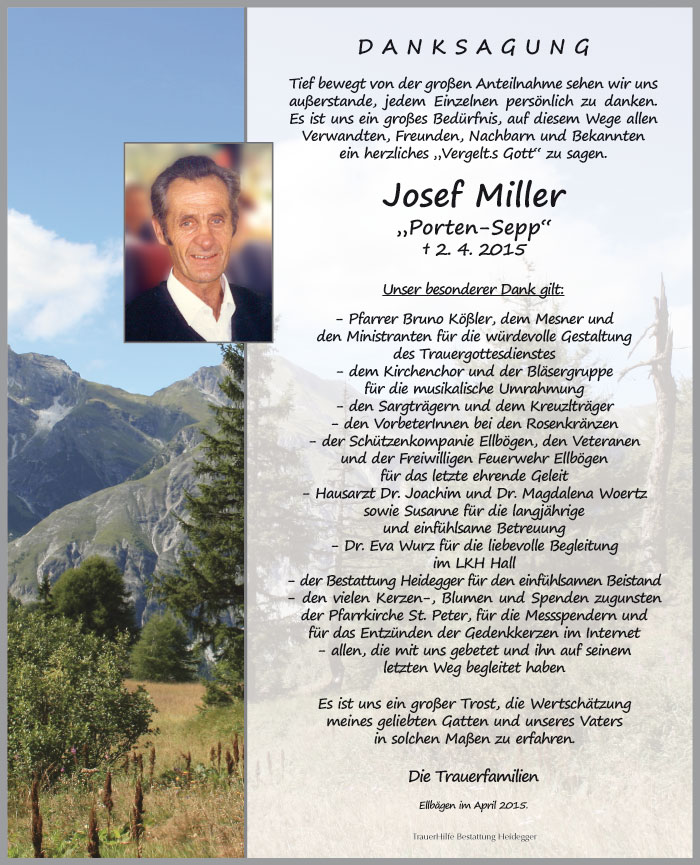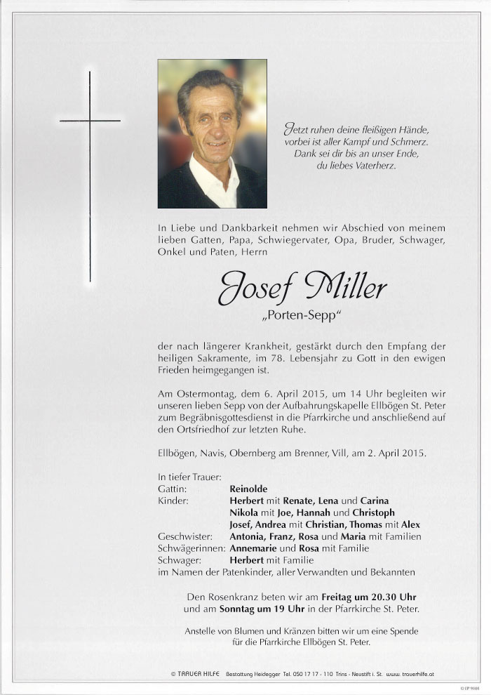Bestattung wurde durchgeführt von: Karl Neurauter Karl Neurauter Bestattung Heidegger Brennerstraße 69 6150 - Steinach am Brenner Tel.: 05275 5211 zum Bestatter