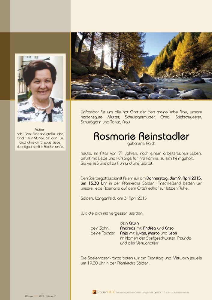 Liebe Rosmarie danke für die schönen Tage die wir mit dir verbringen durften,gerne hätten wir noch mehr mit dir diskutiert und gemeinsam viele dieser Tage erlebt. Pfiat di Rosmarie!