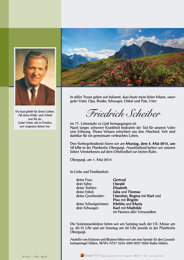 Liebe Trude, lieber Harald, liebe Elisabeth, leider haben wir erst heute vom Heimgang von Friedl erfahren, tief betroffen, möchten wir Euch auf diesem Weg unsere aufrichtige Anteilnahme in diesen schweren Stunden entbieten. In liebevolle Erinnerung an einen lieben Nachbarn.