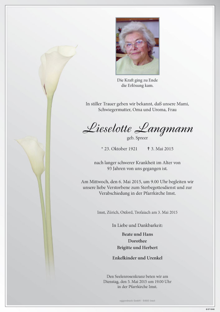 Ich habe erst heute vom Heimgang eurer Mama, Oma und Uroma erfahren. Öfters haben wir uns erzählt, wie es unseren Mamas geht und wie die Krankheit voranschreitet. Jetzt hoffen wir von ganzem Herzen, dass für unsere Mamas ein neues Leben in Gottes Liebe beginnt. Herzliche Anteilnahme von Herta Moll-Schwetz mit Familie06.05.2015 21:41 - Herta Moll-Schwetz
