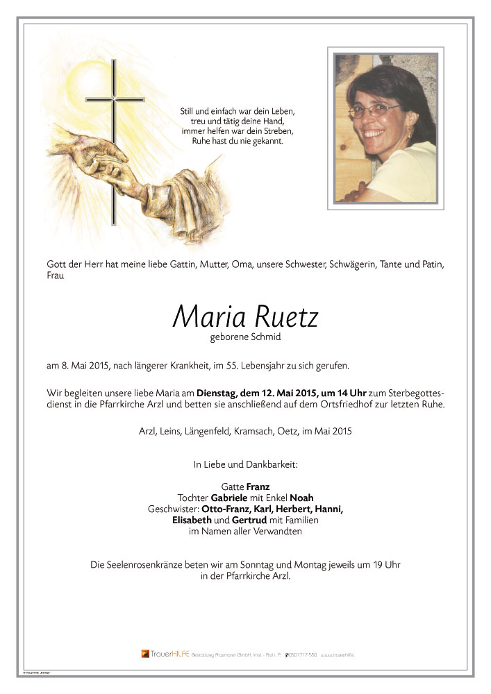 Spuren, die sie in unserem Leben hinterlässt. Ich wünsche Euch viel Kraft in dieser schweren Zeit, ich werde euch dabei begleiten. Maria wird immer in meinem Herzen sein. Deine Schwester! Und Tante!08.05.2015 22:57 - Haug Barbara