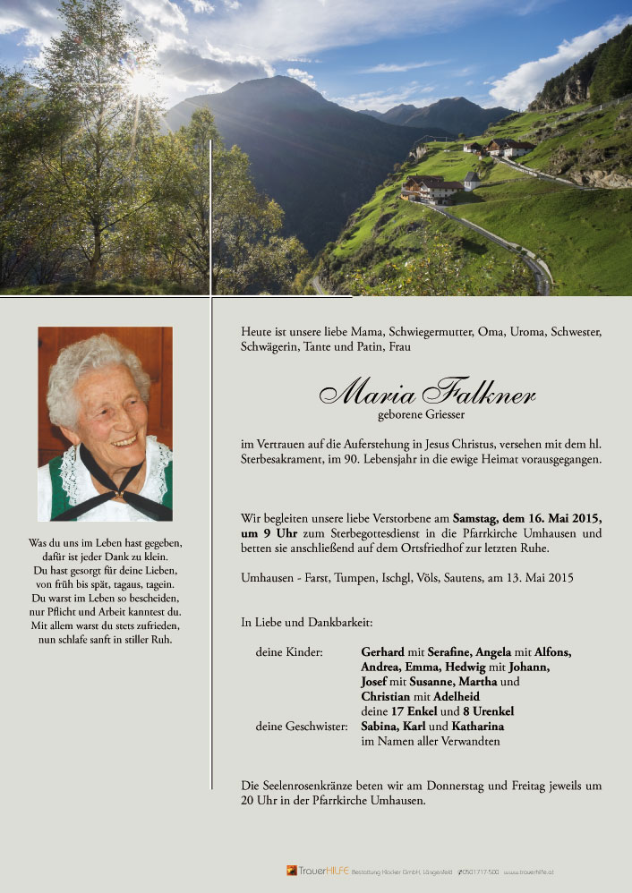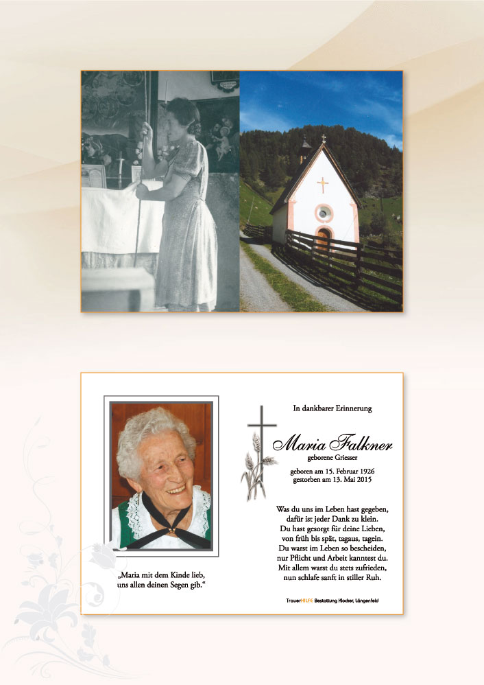 Euch aber, die ihr nun zurückbleibt wünschen wir, dass euch die Namenspatronin eurer Mama, die heilige Gottesmutter Maria, Beistand, Halt und Trost schenkt.
