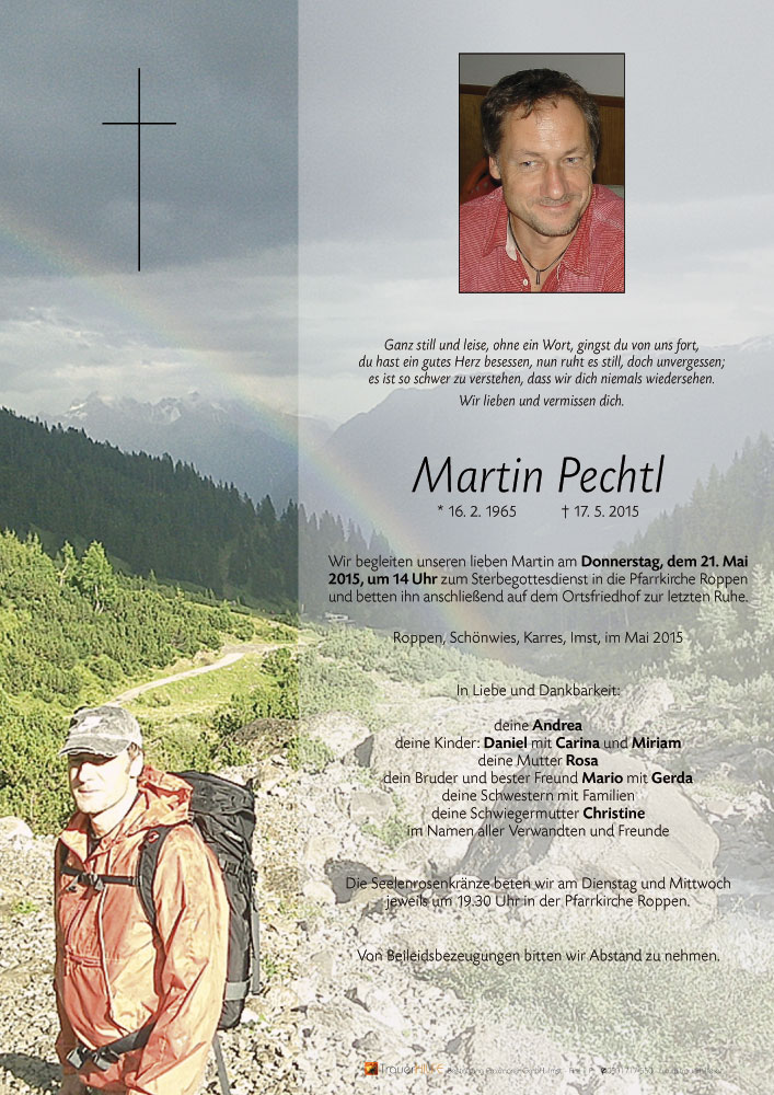 Habe erst am Nachmittag vom Heimgang eures Martin erfahren. Wo die richtigen Worte fehlen, möchte ich euch wissen lassen, dass ich in Gedanken und im Gebet bei euch bin. Gottes Liebe nehme Martin auf und schenke ihm das himmlische Licht. Gottes Liebe begleite euch in dieser schweren Zeit. Aufrichtige Anteilnahme von Herta Moll-Schwetz21.05.2015 20:45 - Herta Moll-Schwetz