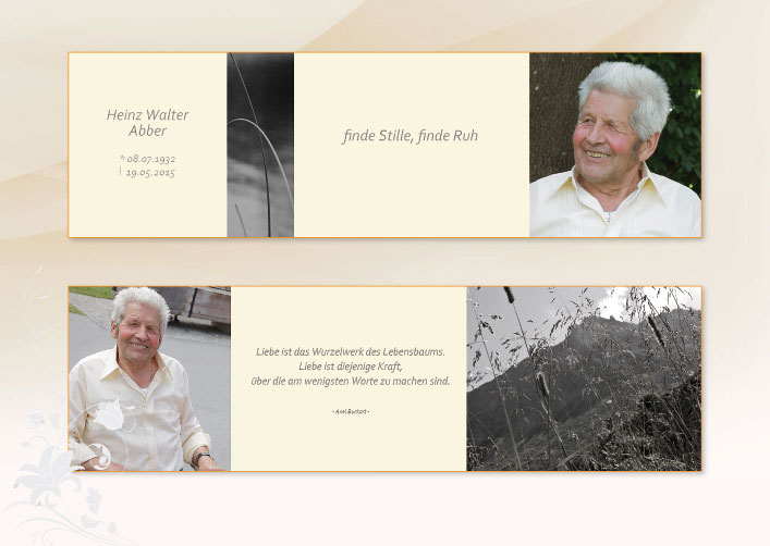 Vertraut auf eure Erinnerungen – sie bleiben unvergesslich. Vertraut auf eure Liebe – sie gibt euch Kraft und Zuversicht. Vertraut auf die Zeit – sie lindert den Schmerz und lässt die Freude wiederkommen.