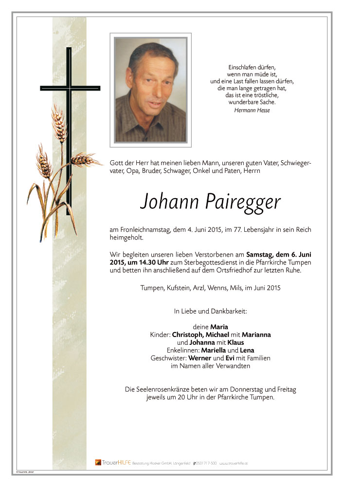 Neue Kerze für Johann Pairegger entzünden.