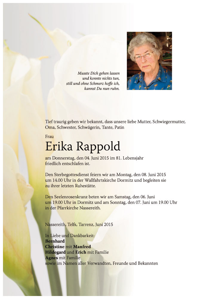 wir wünschen Dir viel Kraft in dieser schweren Zeit und möchten Dir auf diesem Wege unser Beileid ausdrücken.06.06.2015 15:13 - Erich und Ruth Rappold