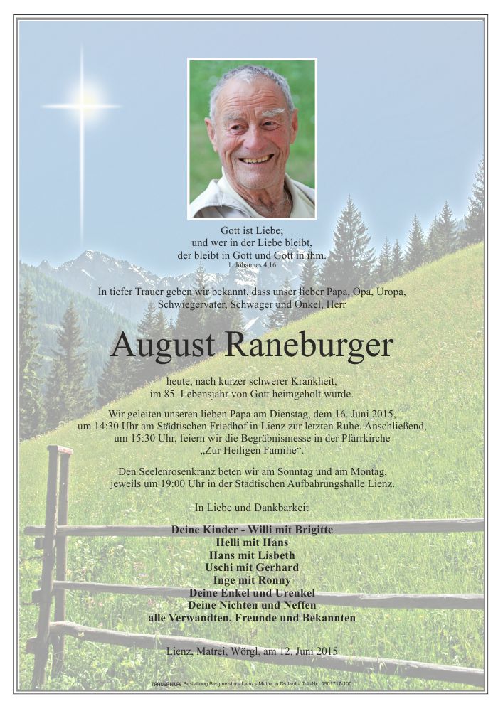 Dass wir dies erst jetzt tun, liegt daran, dass wir zu dieser Zeit in Deutschland weilten. Allen wünschen wir viel Trost und Kraft in dieser schweren Zeit.25.06.2015 15:33 - Herbert und Gertraud Hadwiger