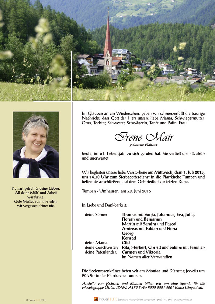 Aufrichtige Anteilnahme am viel zu frühen Heimgang von Irene, entbieten Thomas Ruetz mit Familie03.07.2015 15:16 - Thomas Ruetz mit Fam.