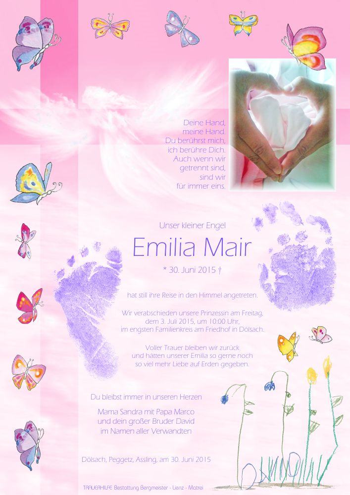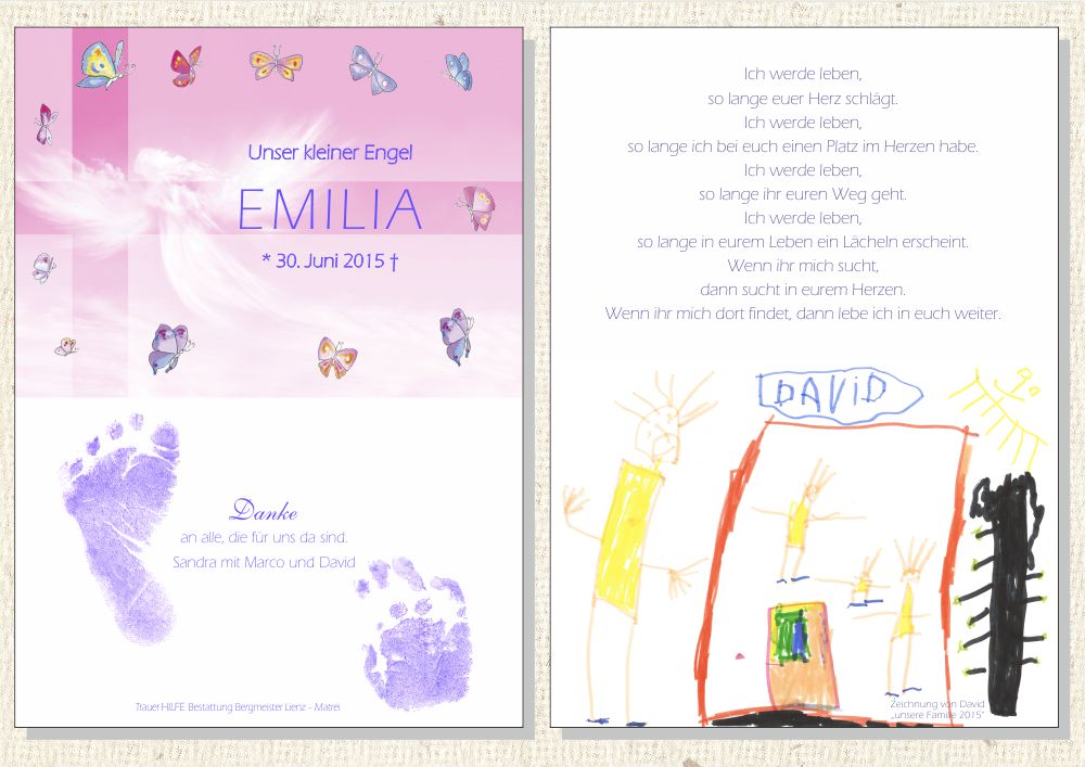 Auch wenn Ihr Eure kleine Tochter nicht mehr sehen könnt, sie wird Euch und ihren Bruder David auf allen Wegen begleiten, Euch beschützen und für immer in Euren Herzen weiterleben.