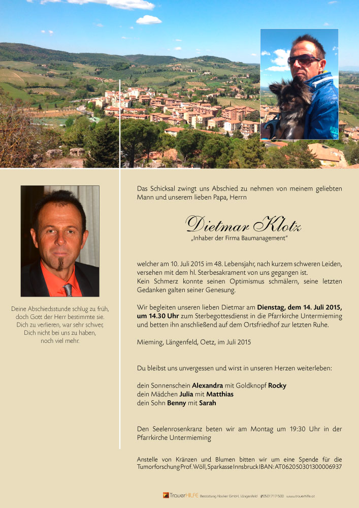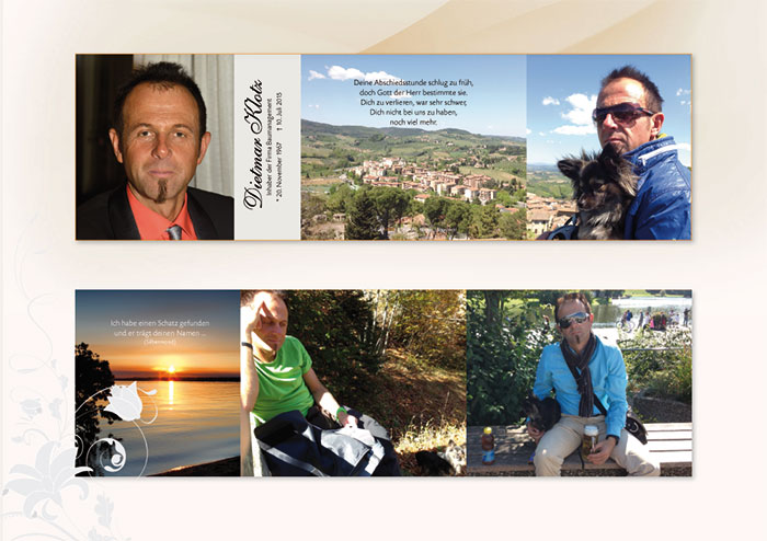tief betroffen habe ich deine Nachricht gelesen vom Tod deines Dietmar, Ich kann es immer noch nicht glauben, aber die Gewissheit , wenn ich das Sterbebild sehe holt mich immer wieder ein.