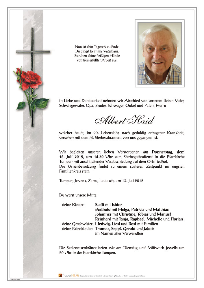 Lieber Albert..." Vergelt`s Gott " für die vielen Spaziergänge die du mit unserem Vater gemacht hast...oder wenn ihr noch auf an "Ratscher" bei euch hinterm Haus gesessen seid....Pfiet di Albert....