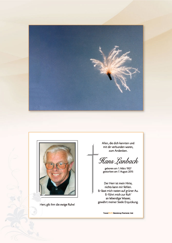 Möge euer Hans in Gottes unendlicher Liebe geborgen sein, begleitet von seinen Engeln. Wir wünschen euch viel Kraft und Segen. Herzliche Anteilnahme von Berni und Herta Moll