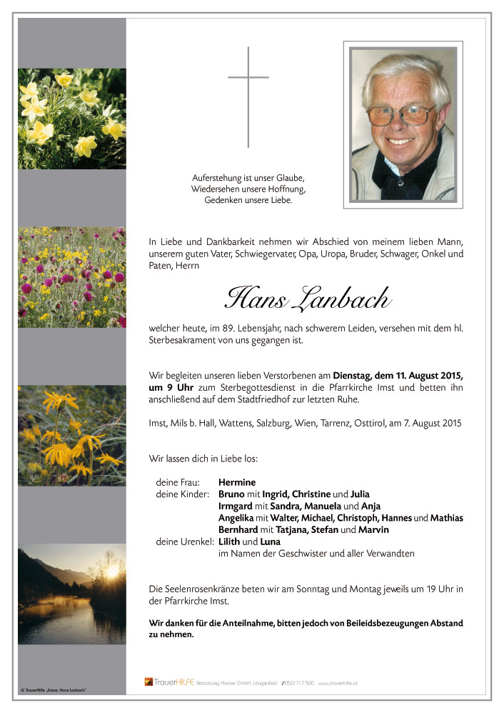 Bestattung wurde durchgeführt von: Daniel Klocker Bestattung Praxmarer GmbH Thomas Walch Str. 4 6460 - Imst Tel.: 05412 64250 zum Bestatter