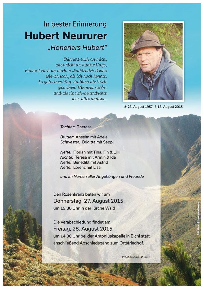 In tiefer Verbundenheit und aufrichtiger Anteilnahme; Hubert NEURURER / Telfs26.08.2015 13:17 - Hubert Neururer - Telfs