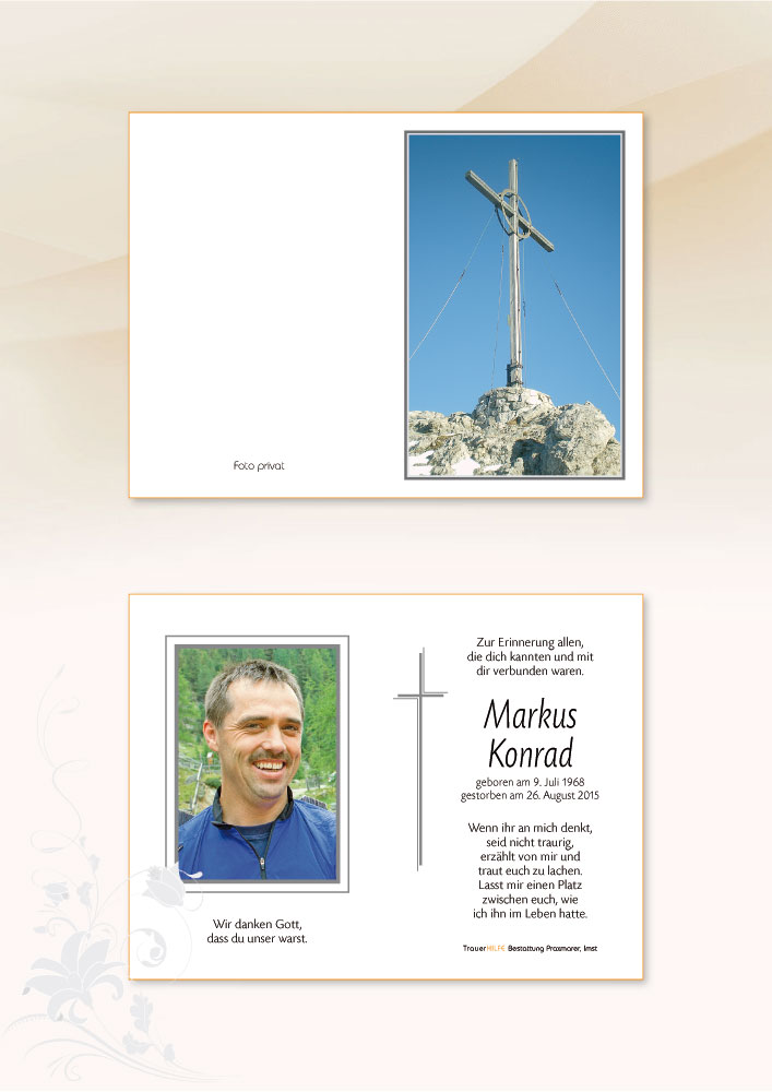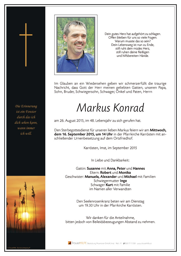 Liebe Susi, liebe Trauerfamilie Still ist er einfach von euch gegangen Gottes Wille traf euch schwer, der Platz vom Markus ist nun leer. Das Auferlegte müßt ihr ertragen, doch die Erinnerungen kann niemand begraben Was er im Leben ist für euch gewesen steht nicht am Grabkreuz zu lesen, unauslöschbar eingeprägt wie Erz lebt er weiter in eurem Herz. Unser aufrichtige Anteilnahme und viel Kraft und Zusammenhalt für diese schwere Zeit. Reingard Gastl m. Fam.