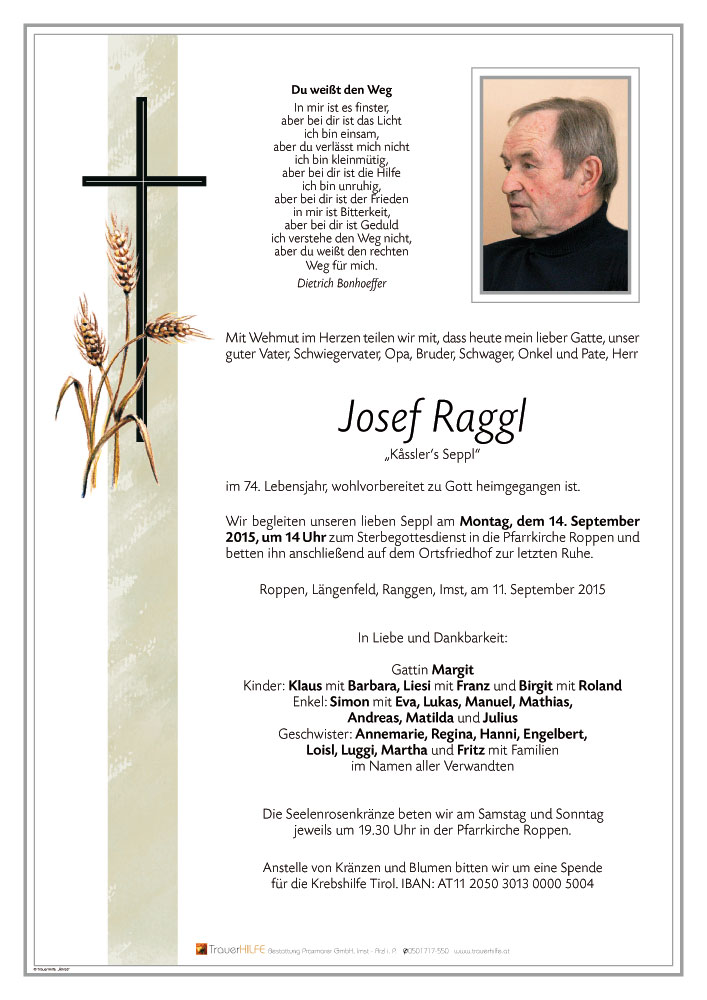 Aufrichtige Anteilnahme und viel Kraft in dieser schweren Zeit wünscht Euch Obmann Günter Neururer für die Ortsbauernschaft Roppen12.09.2015 11:05 - Ortsbauernschaft Roppen