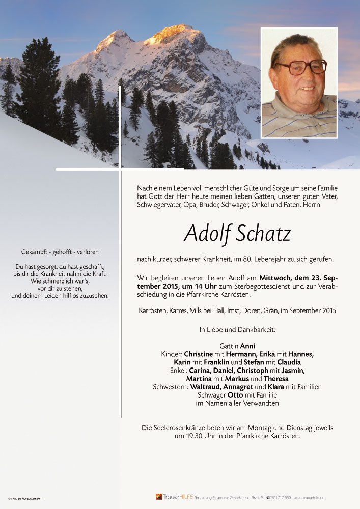 Es war immer eine Freude mit Adolf zu quatschen. Er wir mir fehlen im Pflegeheim. Viel Kraft für die schwierige Zeit.21.09.2015 17:15 - Andrea Knabl m. Familie und Herlinde