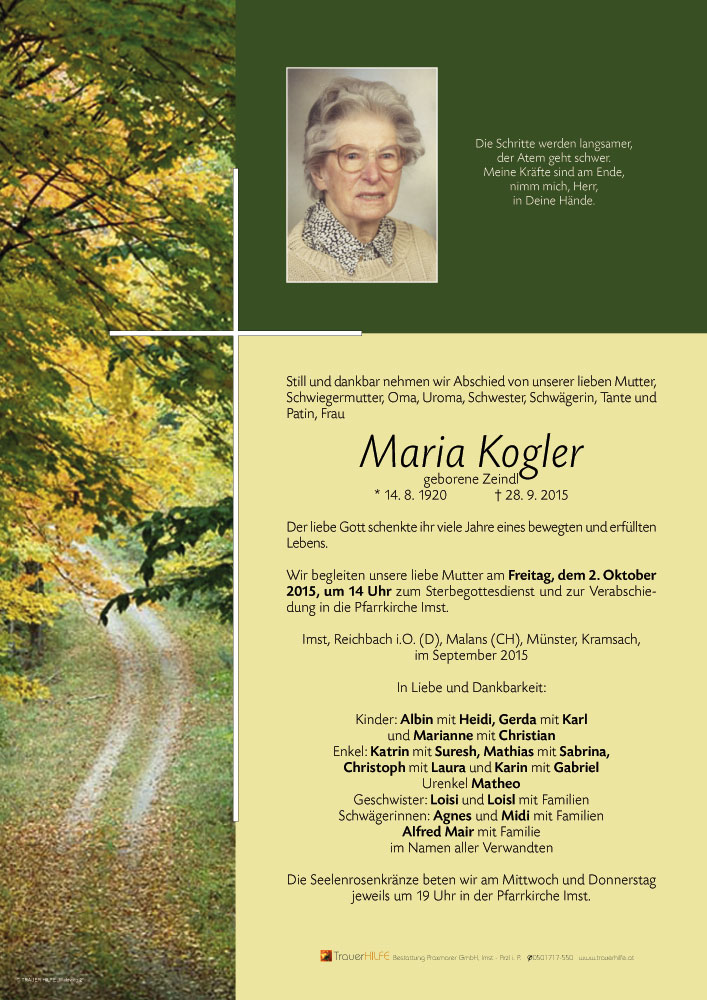 wir entbieten unser aufrichtiges Mitgefühl am Heimgang eurer lieben Mutter und Oma und wünschen euch, dass sich eure Trauer in ein liebevolles und herzliches Erinnern an die vielen schönen gemeinsamen Stunden wandeln möge.30.09.2015 08:04 - Renate & Bernhard Klaunzer