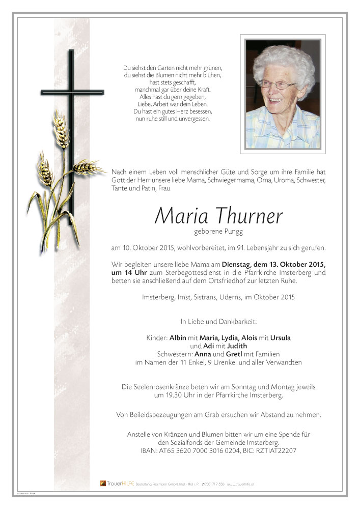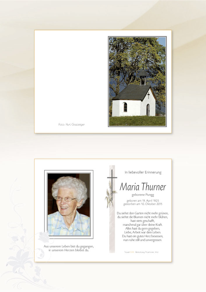 Liebe trauernde Angehörige. Ich kenne Maria schon lange. Von 1981, als ich Alois oft abgeholt habe, bis zum letzten Gottesdienst, wo ich Ihr die Hl. Kommunion reichen konnte. Ich wünsche Euch meine aufrichtige Anteilnahme und Ihr die ewige Freude. Andreas