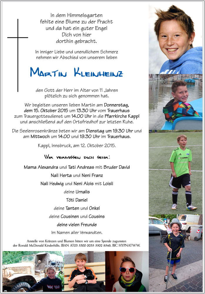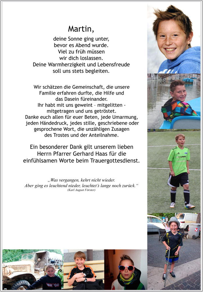 Wir wünschen Euch, dass Ihr die notwendige Kraft habt,trotz des so schmerzlichen Verlustes von Martin, zuversichtlich,in die Zukunft zu blicken.17.10.2015 15:57 - eine mitfühlende Familie aus Kappl