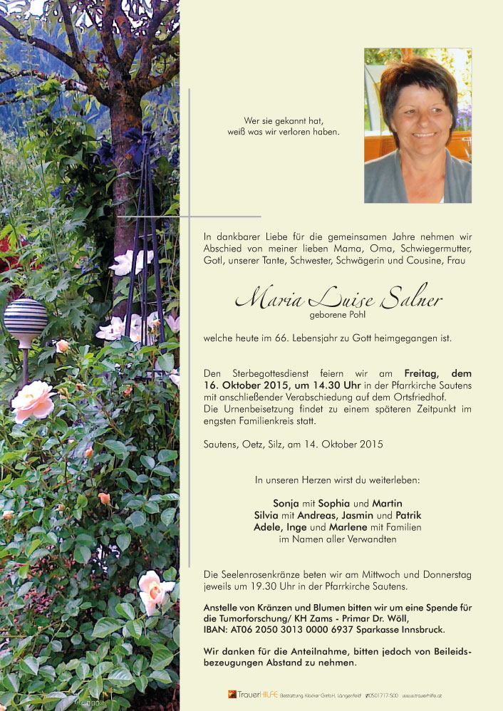 Du warst viele Jahre eine der wichtigsten Personen beim Sautener Theater ob als Spielerin oder als Regiseurin Du hast Deine Rollen gelebt und nicht gespielt.Nun hat sich der Irdische Vorhang für immer geschlossen doch in unseren Herzen wirst Du ewig weiterleben Liebe Luise ruhe in Frieden.Der liebe Gott möge Dir alles vergelten Pfiat di15.10.2015 21:59 - Bezirksobmann Schöpf Gebhard