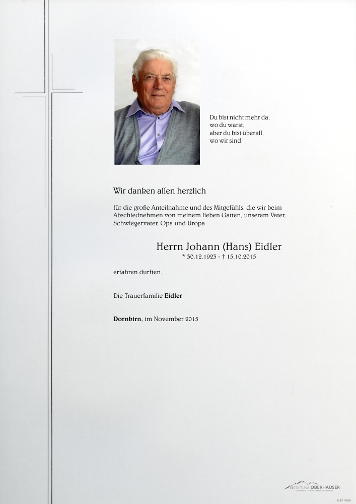 Neue Kerze für Johann (Hans) Eidler entzünden.