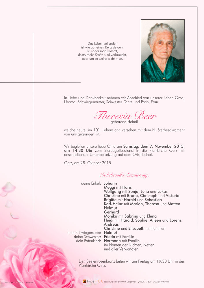 Aufrichtige Anteilnahme zum Heimgang von Theresa entbieten von ganzem Herzen Mechthild und Marianne mit Familie.29.10.2015 18:40 - Santer Marianne