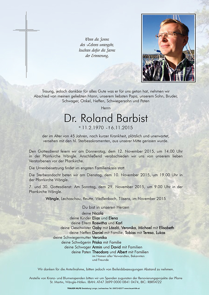 zu unserem aufrichtigen Bedauern erfuhren wir, dass Herr Dr. Roland Barbist vor kurzem verstorben ist. Worte können den Schmerz nicht ausdrücken, den Sie gerade durchleiden. Mit Dr. Roland Barbist ist ein wirklich einzigartiger und geschätzter Mensch von uns gegangen. Wir schätzen uns glücklich, ihn kennen gelernt zu haben und werden Herrn Dr. Barbist in dankbarer Erinnering halten.