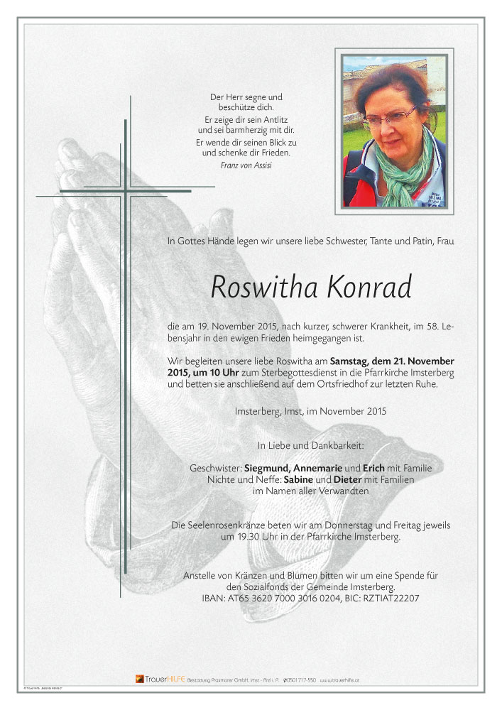 Da wo Roswitha jetzt ist, gibt es kein Leiden mehr, jetzt ist sie erlöst von ihrer Qual.