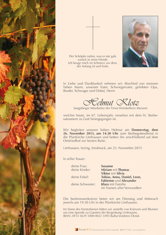 Es ist nie der richtige Zeitpunkt, es ist nie der richtige Tag, es ist nie alles gesagt, es ist immer zu früh - und doch sind Erinnerungen, Gedanken und schöne Stunden da, die unvergessen bleiben diese Momente gilt es einzufangen und im Herzen zu bewahren. Liebe Trauerfamilie - Für uns war Helmut immer ein treuer und verlässlicher Kamerad, vorallem auf der Gampe Alm. Sein Wissen und seine Hilfsbereitschaft werden uns immer in Erinnerung bleiben... Ganz viel Kraft in dieser schweren Zeit.