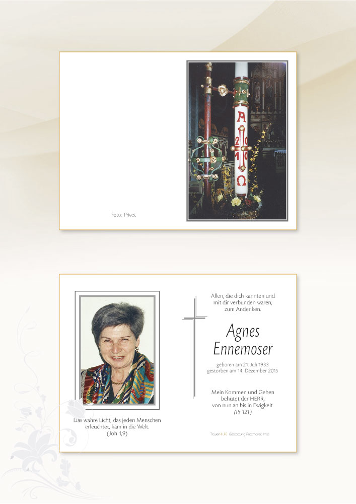 Neue Kerze für Agnes Ennemoser entzünden.